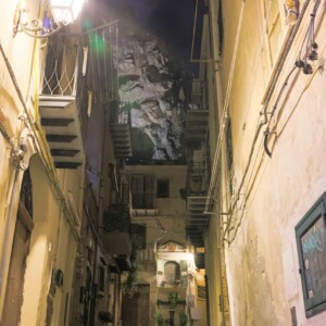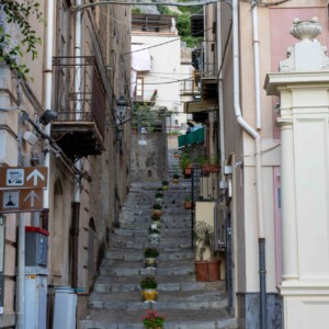 We traveled through mountain tunnels and estuary bridges. Within an hour we were at Santo Stefano di Camastra. Once we got off the train, we stood at a landing. It had a few small buildings. An angry couple was fighting, and they jumped in their car and sped off. After that we were practically alone at the train station. Looking up at the city almost 300 feet above us trying to figure out how to get to it.