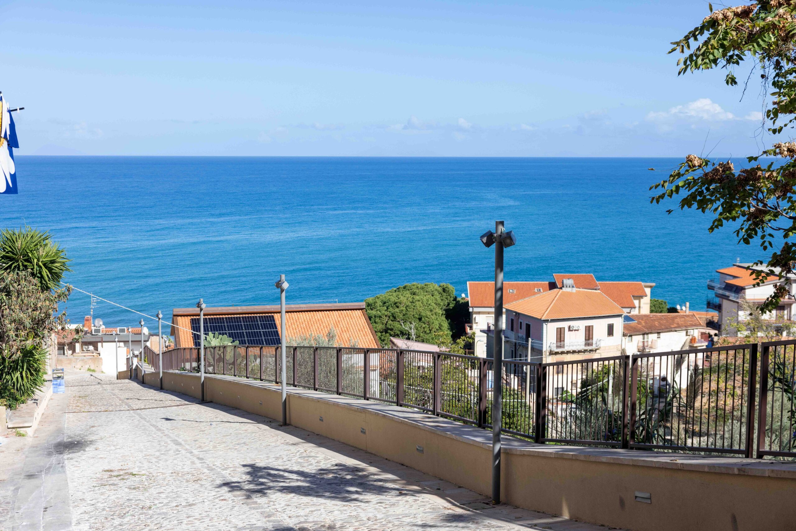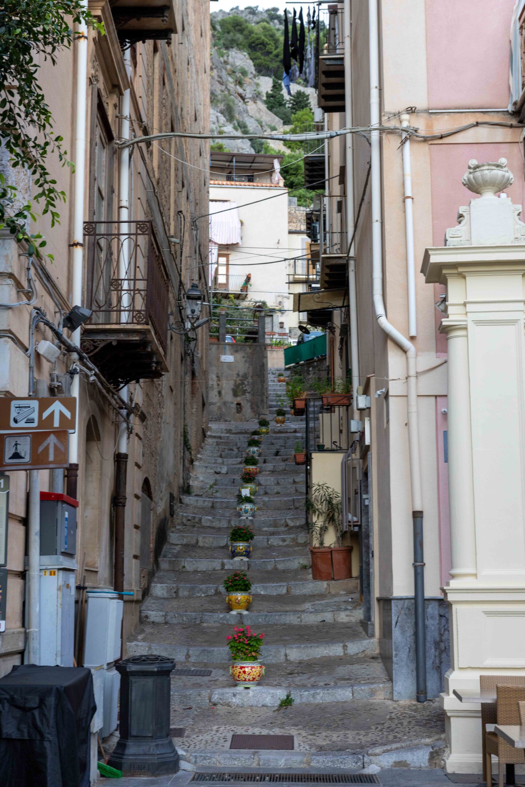 We traveled through mountain tunnels and estuary bridges. Within an hour we were at Santo Stefano di Camastra. Once we got off the train, we stood at a landing. It had a few small buildings. An angry couple was fighting, and they jumped in their car and sped off. After that we were practically alone at the train station. Looking up at the city almost 300 feet above us trying to figure out how to get to it.